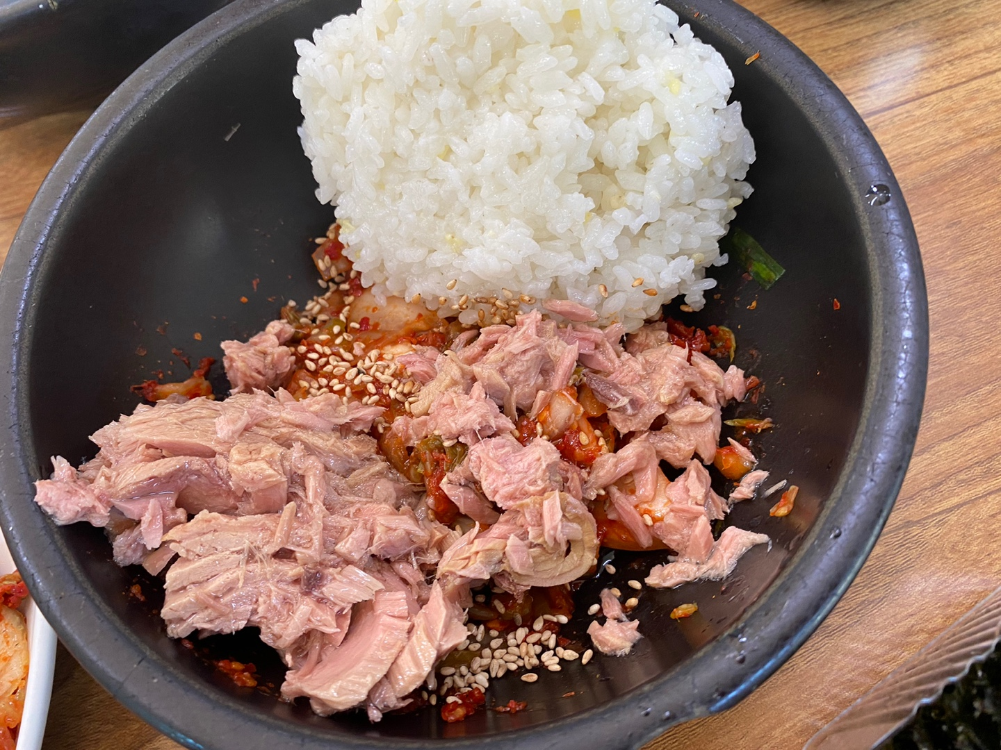공기밥도 추가하고 하니 김치 짤라주시고 참기름 한바퀴 둘러주신 그릇에 참치 넣고 비빔..